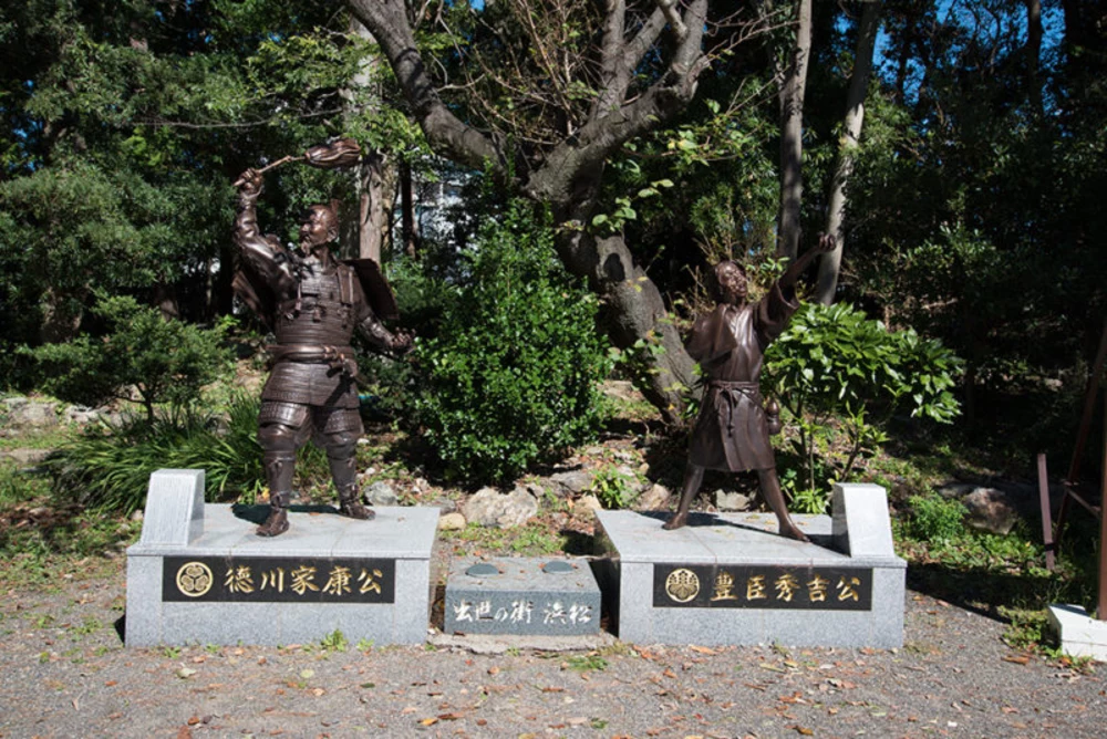 小さな境内に立派な家康公と秀吉公の銅像が目に飛び込んできます。先ほどまでの厳かな空気が、一瞬で吹き飛ぶほどの存在感です。