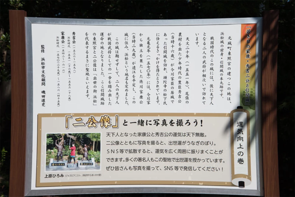 この城を期せずして、二人の天下人が戦国武将としての一歩を踏み出した運命の地となりました。ここ引間城跡の東照宮と二公像は「出世の街 浜松」を代表するまさに聖地といえます。