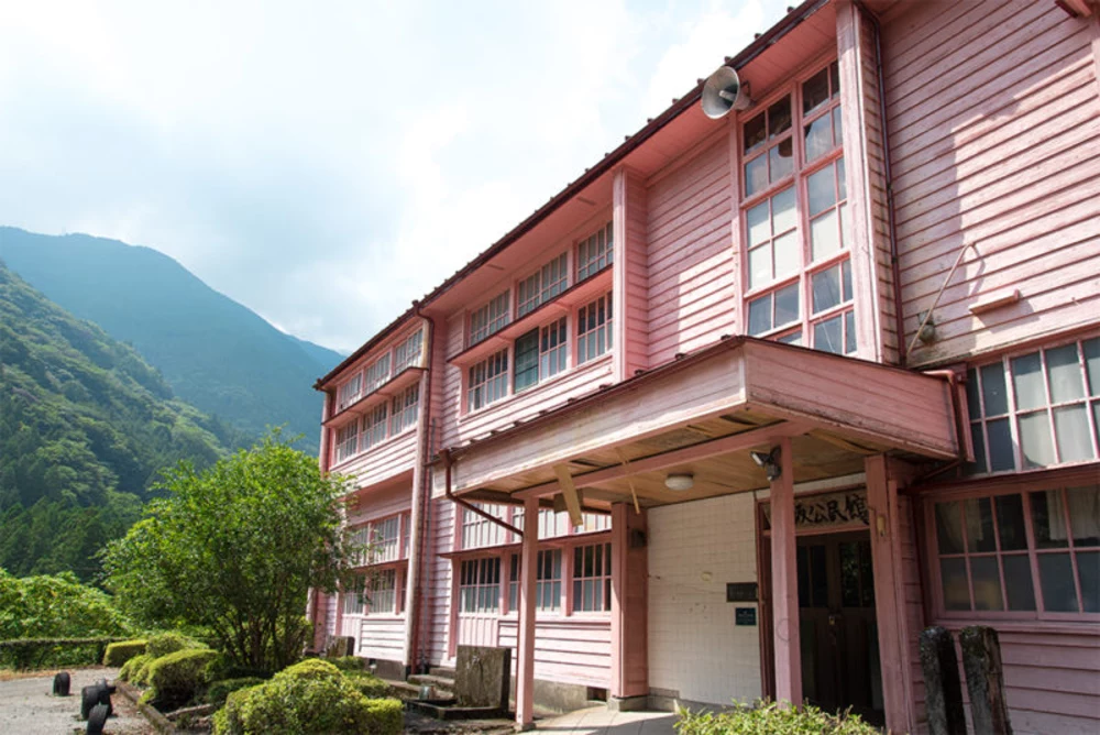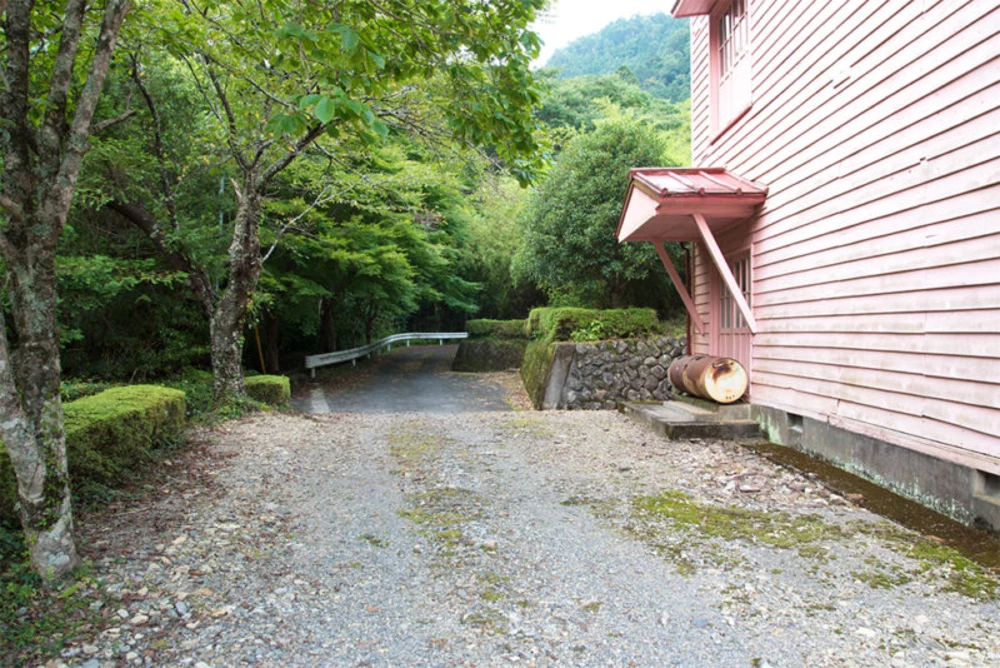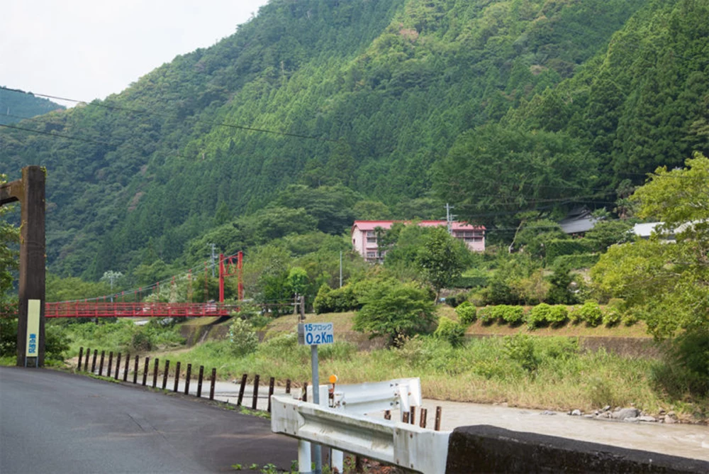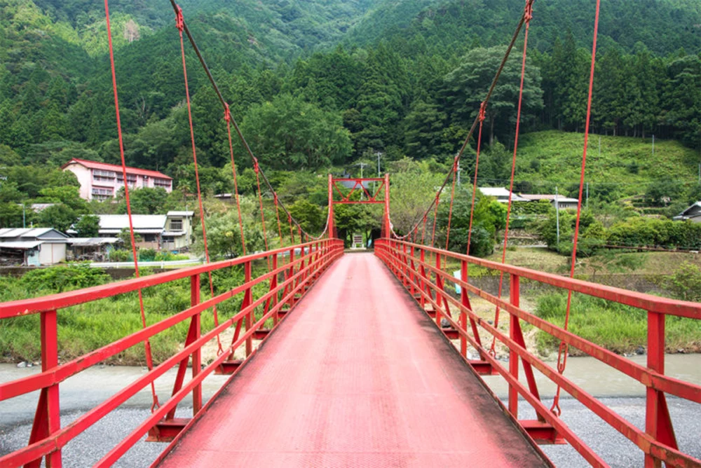 清流で知られる気田川ですが、この日は梅雨明け直後ということもあり残念ながら水が濁っていました。気田川沿いを北上すること15分。赤い吊橋と緑に囲まれたピンク色の校舎が見えてきました。