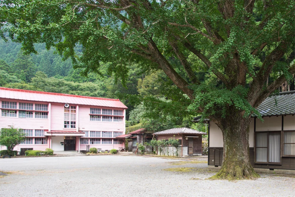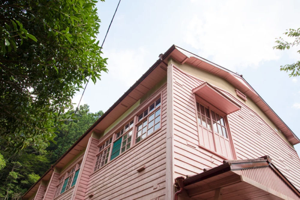 青い空と深緑とのコントラストが鮮やかな2階建ての木造校舎(登録有形文化財)