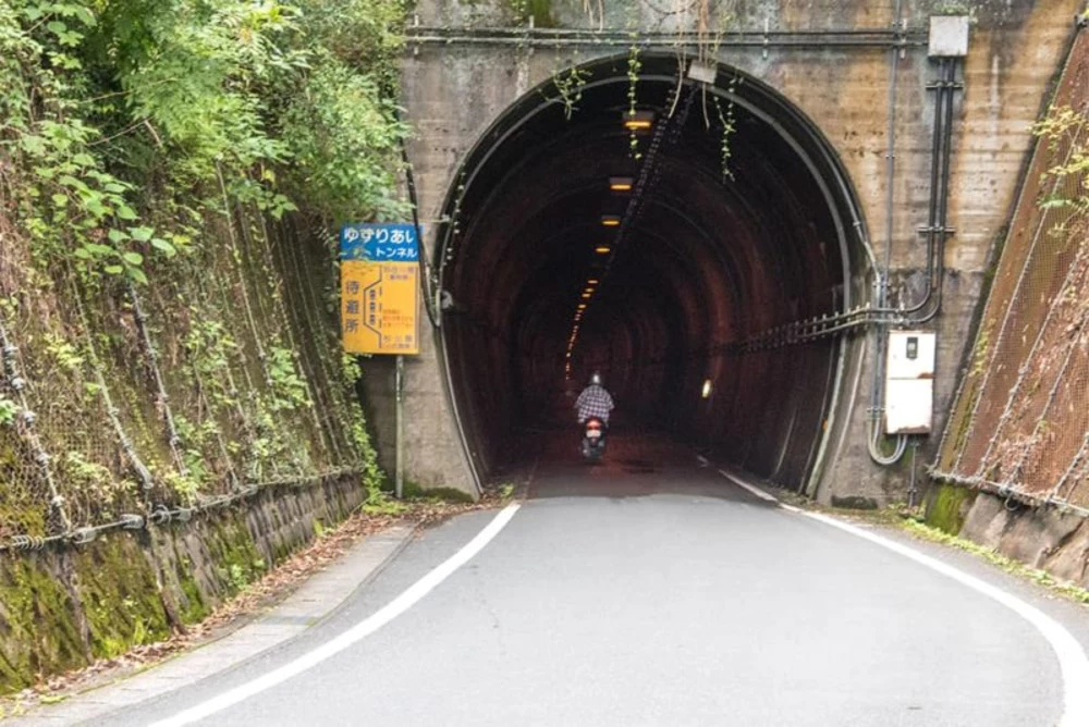 躊躇なくトンネルに突入するおばちゃんライダー。389号線に入ってすぐにトンネル(小石間隧道)が見えてきます。どう見ても1車線分の車幅しかなく、「対向車が来たらどうしよう…」と躊躇してしまいます。中間地点にすれ違うことができる待避場所がありますが、対向車が来ていないか注意して侵入しましょう。