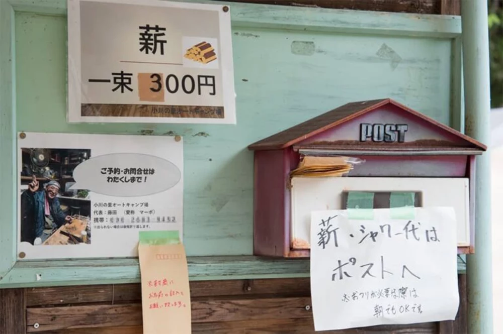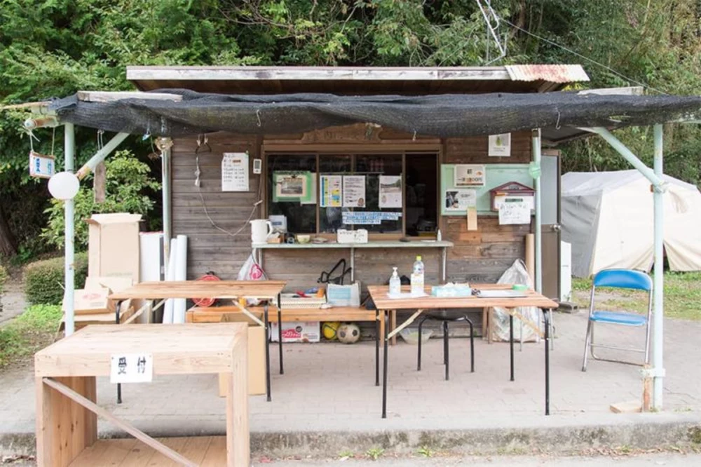 駐車場にある受付で管理人さんに予約名を伝えます。管理人さんからキャンプ場の簡単な説明を受けて入場です。こちらの受付で薪や炭、氷、お茶などが販売されています。(どれも数に限りがありますので、ご注意ください。)