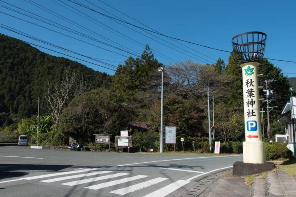 「秋葉神社P」の案内を左に入ります。キャンプ場の一部は秋葉神社(下社)参拝者用の駐車場になっていますので、ご注意ください。