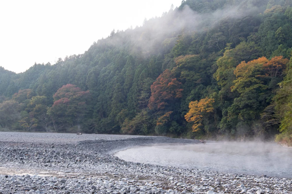 眼前180度に広がる山の緑がとてもきれいで開放感抜群です。深夜、妙に大音量で聞こえる川の音も心地よい。今の時期は紅葉したイチョウが見頃なのですが、木の下には潰れた銀杏が大量に落ちているので注意しましょう。