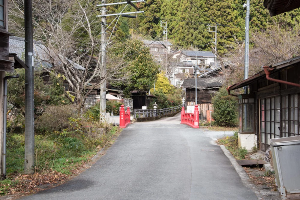 ちんまりした赤い橋(九里橋)が見えてきました。この橋がこれから続く上り坂のスタート地点です。
