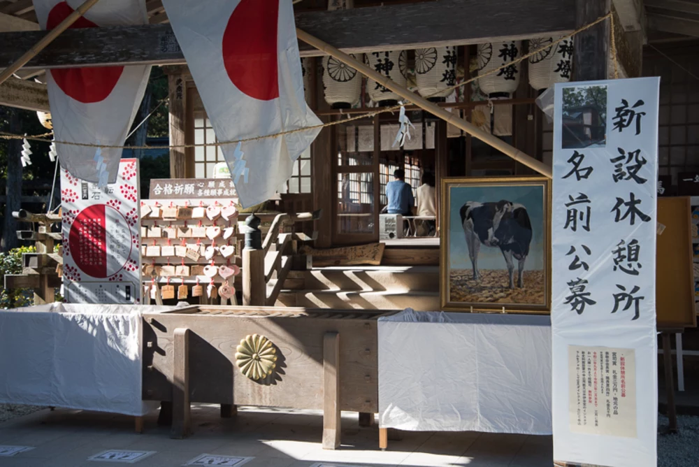写真右に写る牛の絵は浜松市の画家、池谷さち子さんが奉納した油絵。井伊谷宮では10年ほど前から地元の画家に干支にちなんだ絵の制作を依頼しているそうです。