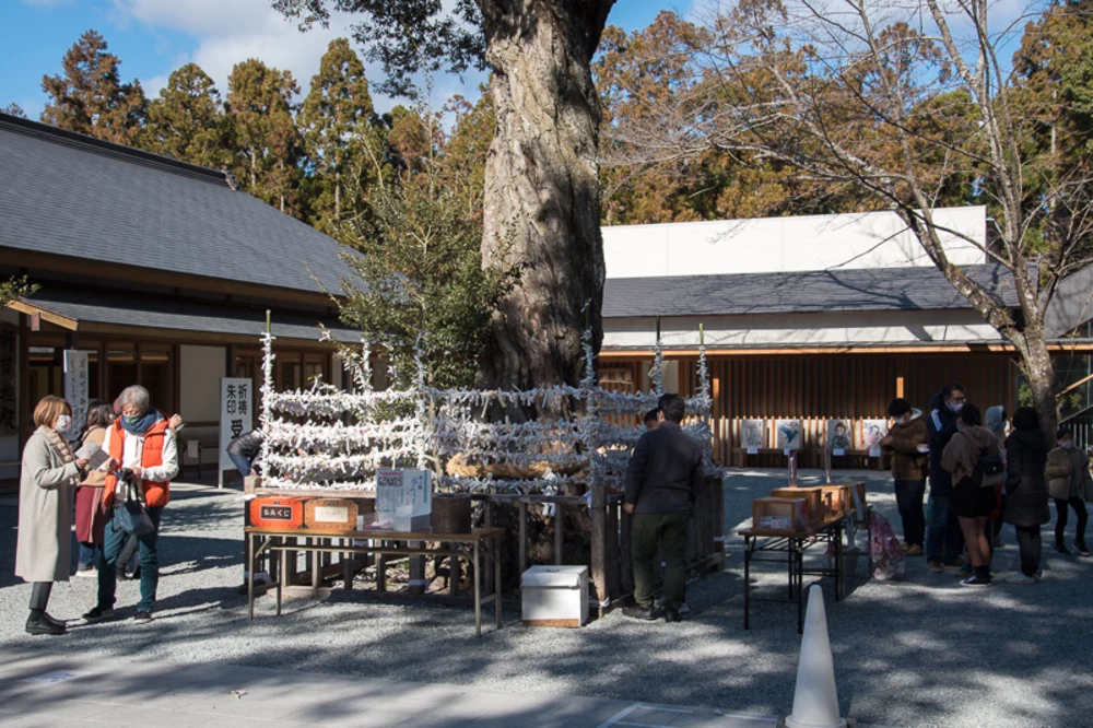 広場中央の御神木のまわりに隙間なく結ばれたおみくじ。一般的におみくじで悪い事が書いてあった場合、凶を神社にとどめて、吉に転じますようにと、願いを込めて結ぶ意味合いがあるそうですが、これだけのおみくじに囲まれると御神木様も大変です(笑)