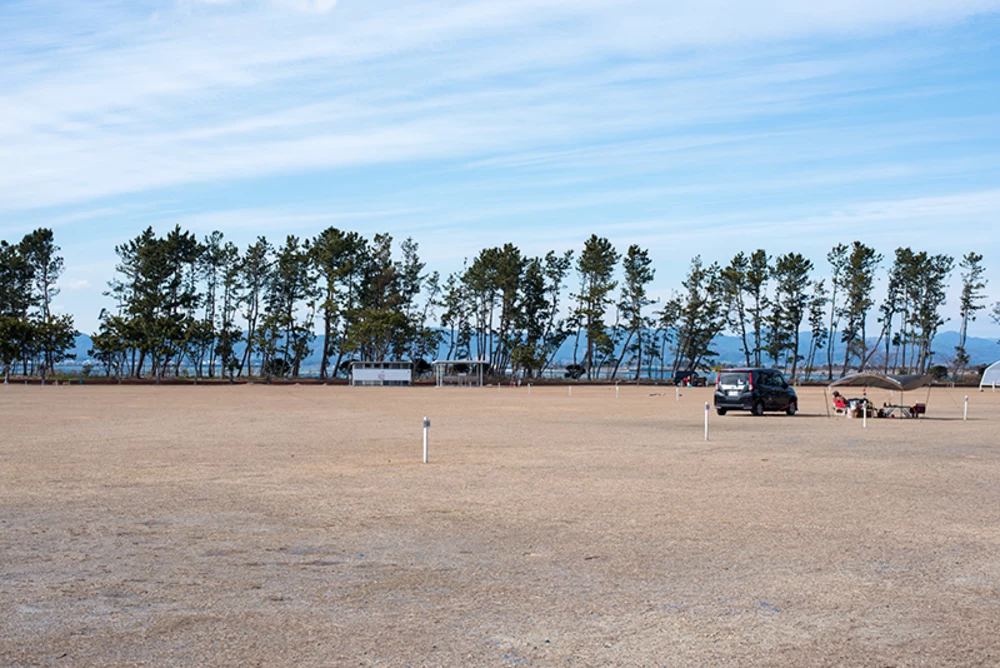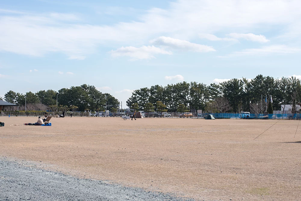 約10,000㎡の芝生広場です。車の乗り入れはできませんので、荷物は無料で貸し出されているリアカーで運びます。(自転車・バイクの乗り入れは可能です。)