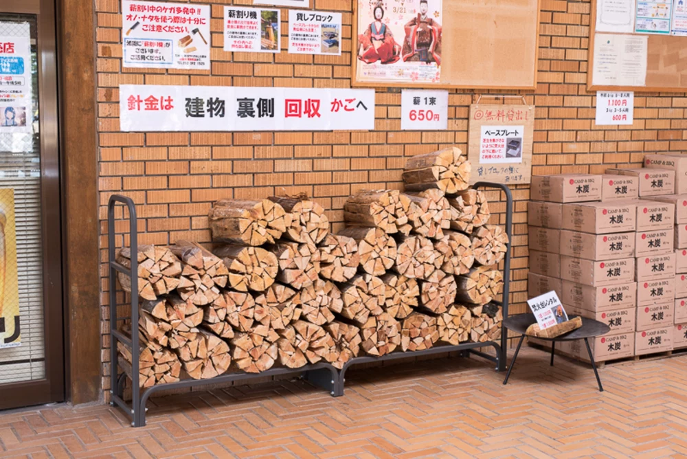 受付横で売られている薪と木炭。週末などの混雑時の遅い時間には売り切れになることもあるので、ご注意ください。