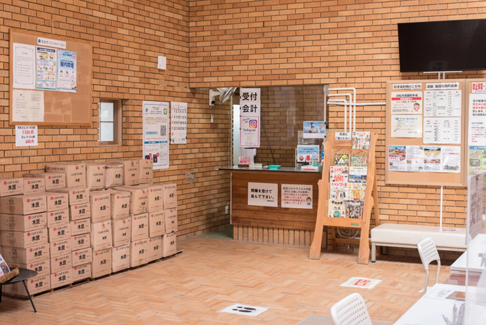 渚園は浜名湖の一部を埋め立てによってつくられた浮島で、島全体に様々な屋外運動施設が設けられています。渚園の約半分がキャンプ施設で、オートキャンプが100サイト以上収容できる広大な芝生広場になっています。開放的な芝生広場はコンサートなどのイベント会場としても利用されています。受付