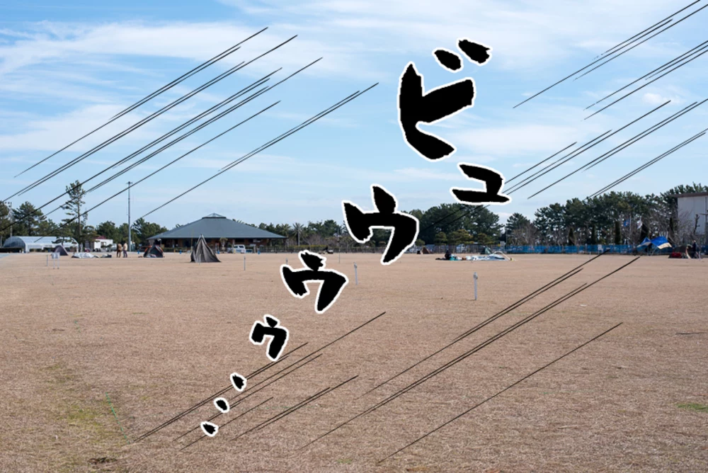 もともと浜松市は「遠州のからっ風」と言われる乾いた強い風が吹く土地柄です。そして浜名湖の浮島という立地のため周囲に遮蔽物がないので、浜名湖から強烈な風がキャンプサイトに吹き込みます。