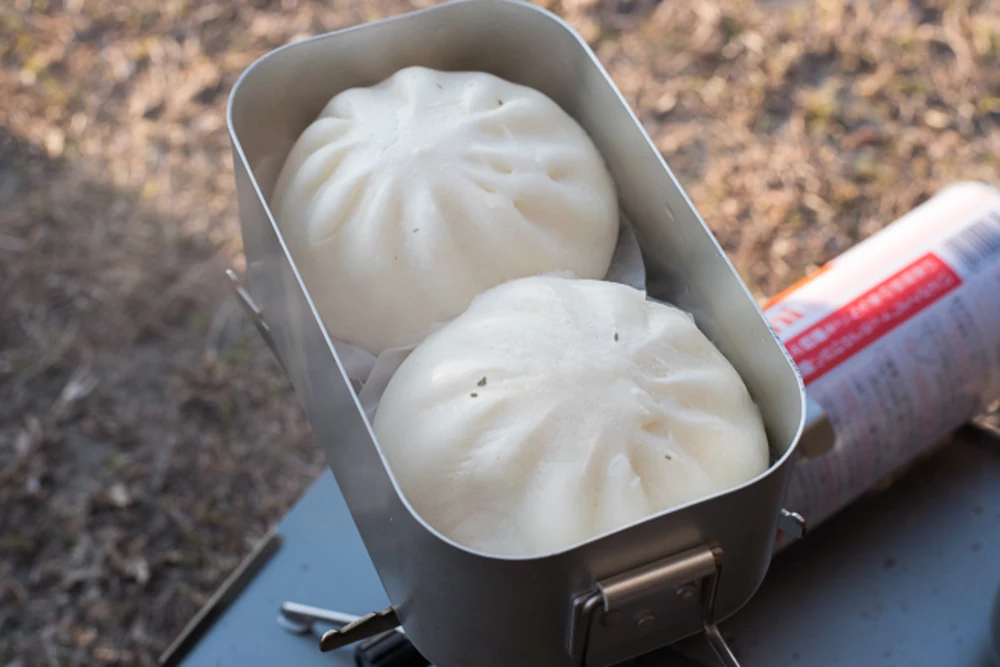 風で舞い上がった、焚き火の灰や枯れた芝のフリカケはキャンプ飯の醍醐味!気にしてはいけません。