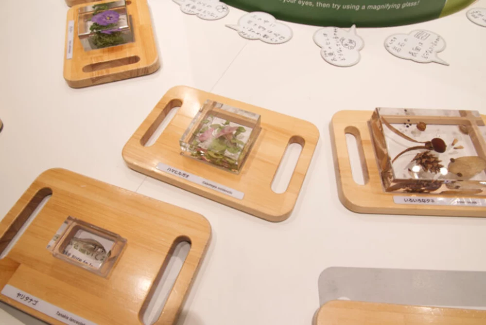 「アクティブ・リサーチ・デスク」には昆虫や魚、植物、岩石の標本があります。