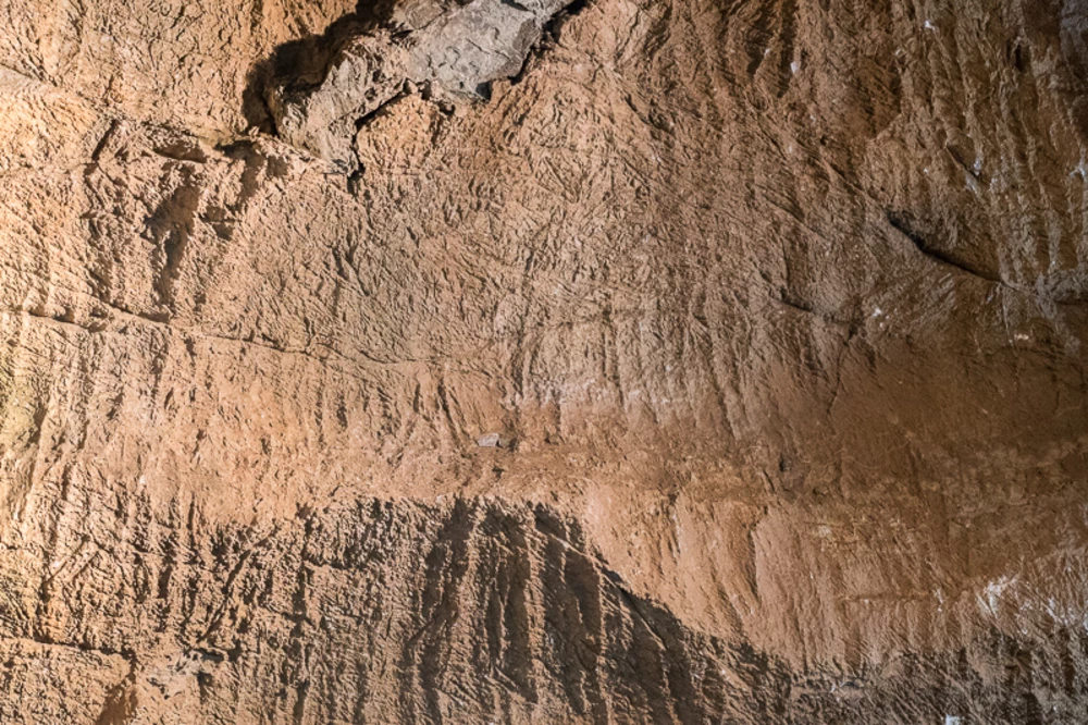 壁面に刻まれた細かな溝は溶食条溝といって壁を伝って流れた水によって長い年月をかけて作られたもの。岩なのに動物の皮膚のように見えるのが不思議。