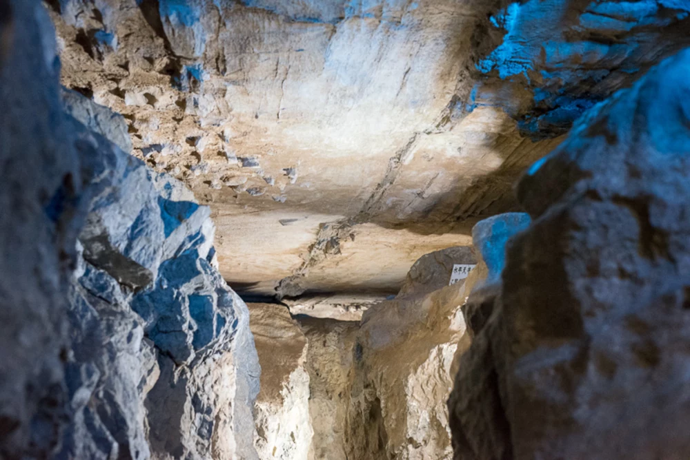人工的につくられたように見える真っ平らに広がる天井の岩盤。このような特徴のある鍾乳洞は、国内で鷲沢風穴だけだそうです。
