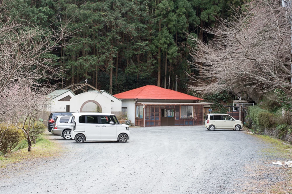 赤い屋根の建物が受付です。受付には地元でとれた特産品販売コーナーや、「風穴の泉」と命名された湧き水などが販売されています。詳しくは同じ敷地内にある鷲沢キャンプ場の記事で紹介していますのでこちらもご覧ください。