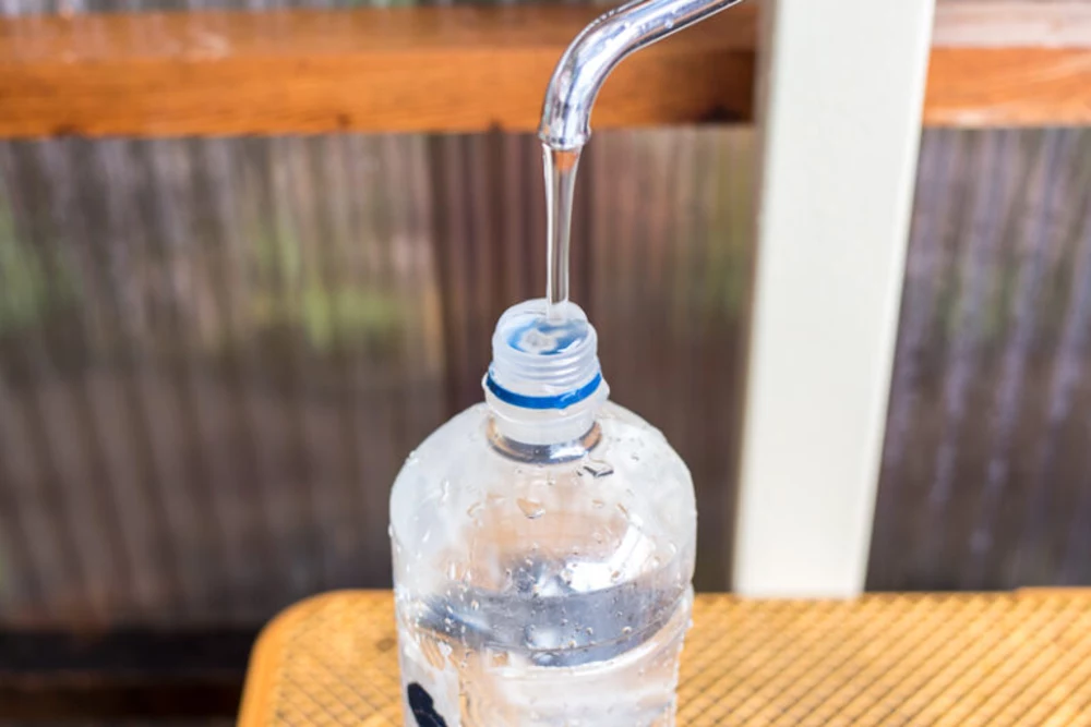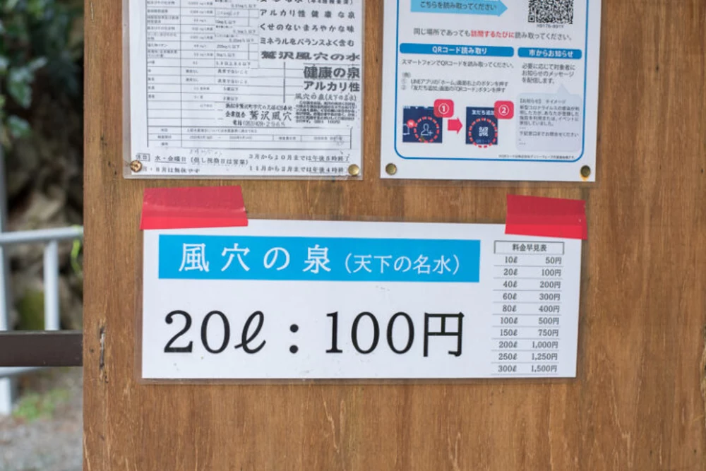 受付の隣に鷲沢風穴から湧き出る清水が販売されています。(年4回水質検査済み)