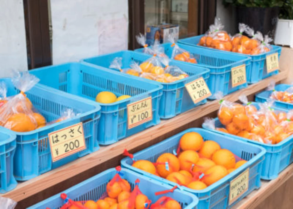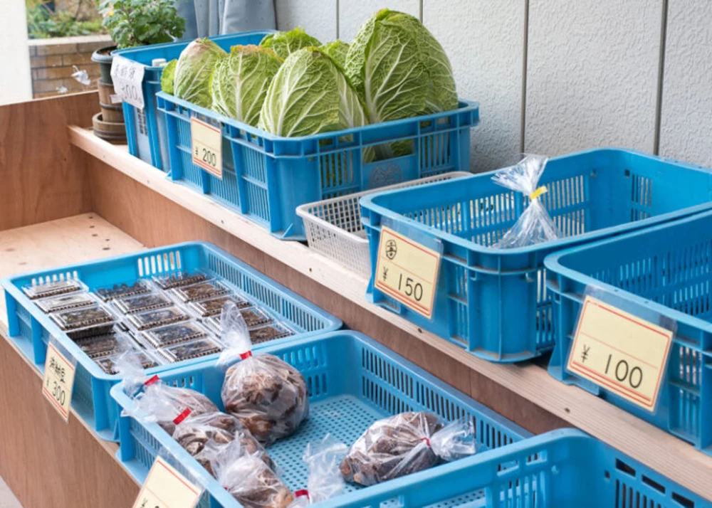 受付建物の前面に地元の農産物販売コーナーがありました。どれも良心的な金額です。季節によって並ぶものも変わるので、これも楽しみですね。キャンプめしのお供に是非!(私はみかんとさつまいもを購入)