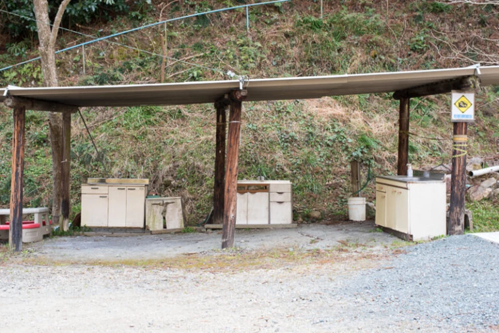 流し台は一つです。電源もありますが、キャンプサイトから離れた場所にありますので、非常時の使用程度と考えておきましょう。