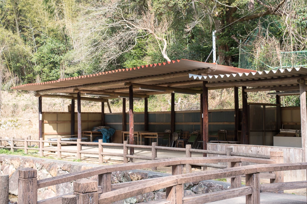 日帰りで利用できるバーベキュー場。前面に小川が流れていて開放感があります。さすがに寒い季節に利用者はいなさそうですが、管理者さんによると夏は団体で利用される方も多いそうです。
