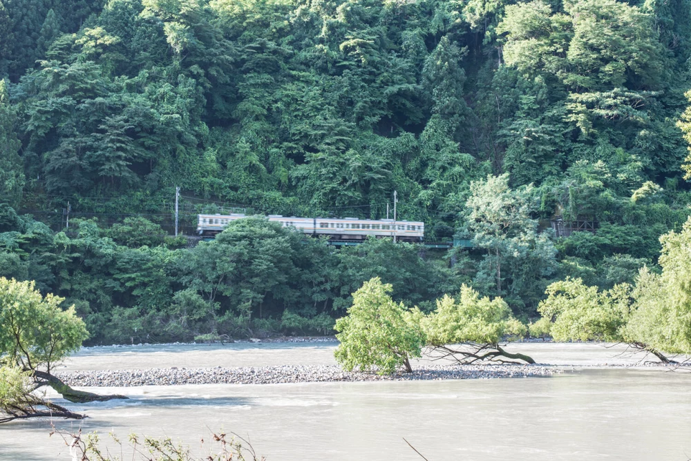 キャンプ場に沿って流れる天竜川。この日の水質はあいにくの状態ですが、川向うを小気味良い音を立てながら飯田線が走ります。キャンプ場から徒歩5分のところにJR飯田線「佐久間駅」があります。浜松駅→(東海道本線)→豊橋→(飯田線)→佐久間という電車キャンプもできますね。但し、豊橋駅から佐久間駅まで2時間半(30駅!)ですので、ご注意を。