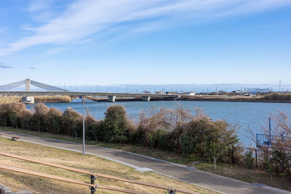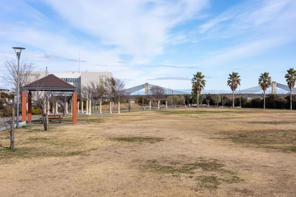 隣に流れる新川は浜名湖河口付近で川幅が広く雄大な眺め公園から歩いて行ける距離にホームセンターやスーパー、弁当屋さんなどがあるので、買い物の前後に立ち寄るのもいいですね。また、約100台停められる無料駐車場があるのもうれしいポイントです。