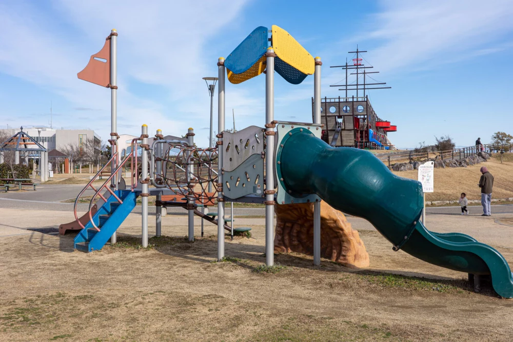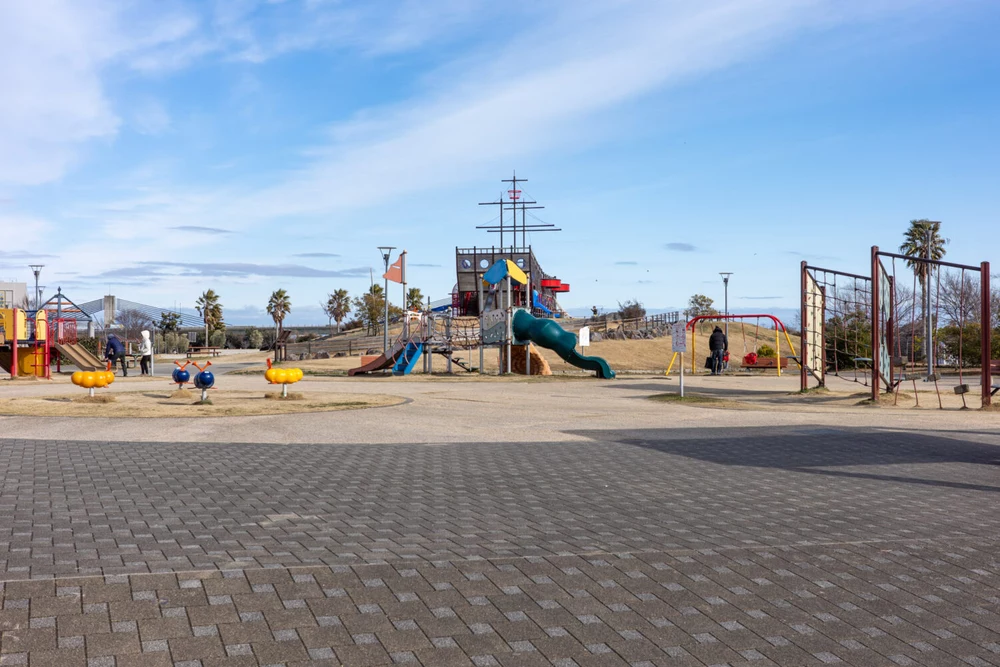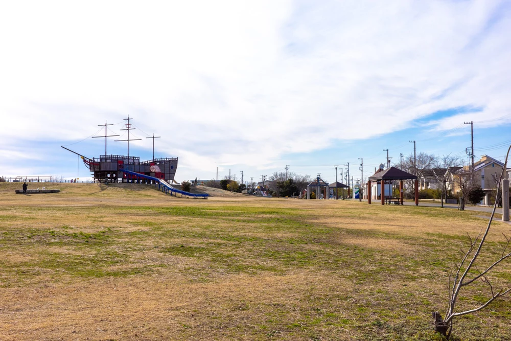 浜松市西行政センターに隣接する「とびっこ公園」の愛称で親しまれている堀出前(ほりでまえ)中央公園。公園のイチオシはなんといっても帆船型の巨大木製遊具。その他にも様々な遊具や、ボール遊びOKで開放感いっぱいの芝生広場や夏に大盛況の噴水エリア、野鳥観察デッキなど、遊びスポットが盛りだくさんの公園です。とびっこ遊具広場