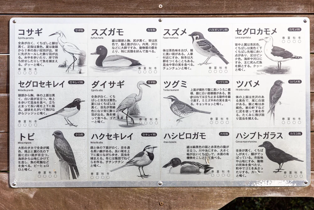 野鳥を驚かせないように観察できる観察穴。ちゃんと子ども用の高さの穴も設けられています。野鳥観察デッキの櫓の壁には穴が空いていて、野鳥から隠れて観察できます。公園周辺の自然や隣に流れる新川に集まる下記案内板の野鳥に会えるかも!?