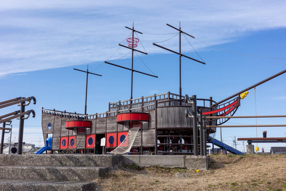 当公園のシンボル、小高い丘に置かれた海賊船?を模した木製遊具。遠くからでもとても目を引く造形で大人でもちょっとテンションが上ってしまいます。帆が付いていれば浜松特有の強風(からっ風)に乗って動き出しそうな完成度です。