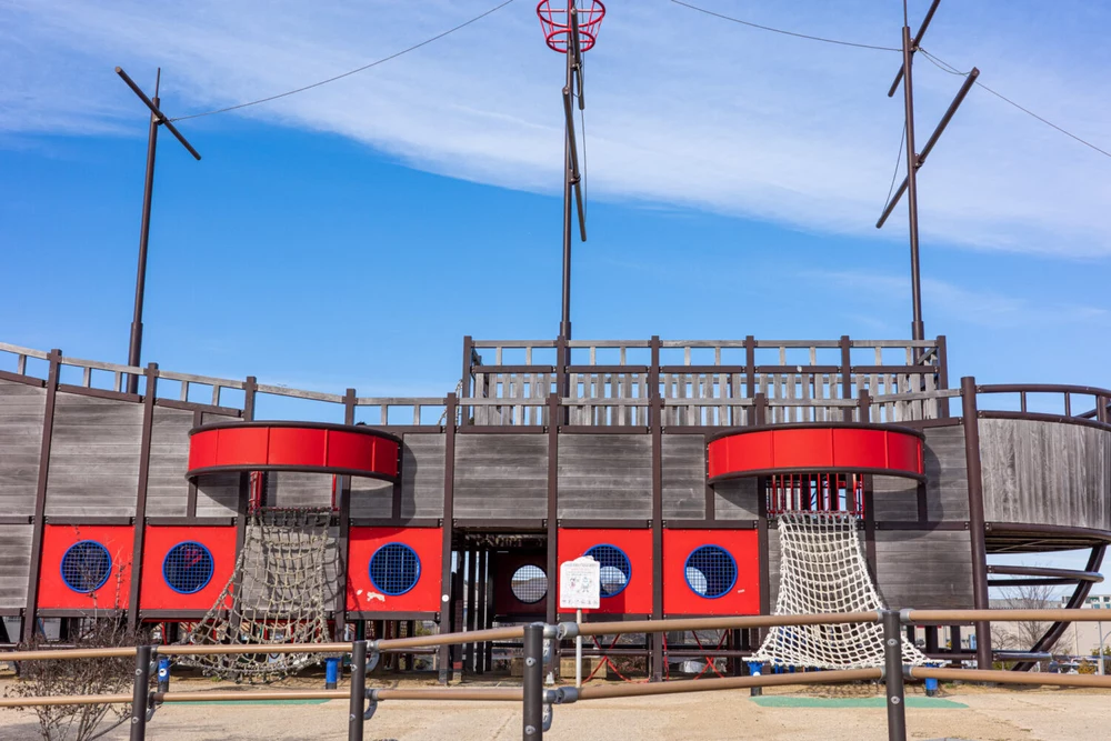帆船遊具は甲板を隔てて2階構造になっています。体をいっぱい使った遊びポイントが盛りだくさんなので、子供は動きやすい服装がおすすめです。