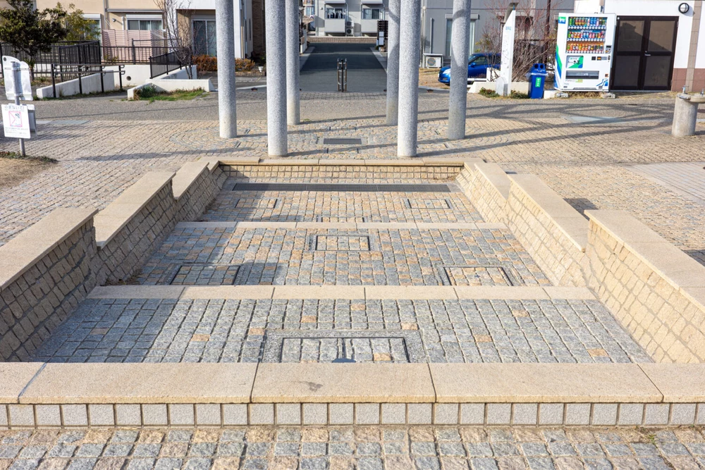 冬の撮影でなんだか寂しい写真ですが、夏には盛況な地面から水が吹き出す噴水エリア。水深は浅く設定されているので小さな子どもでも安心して水遊びができそうです。
