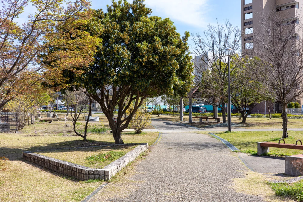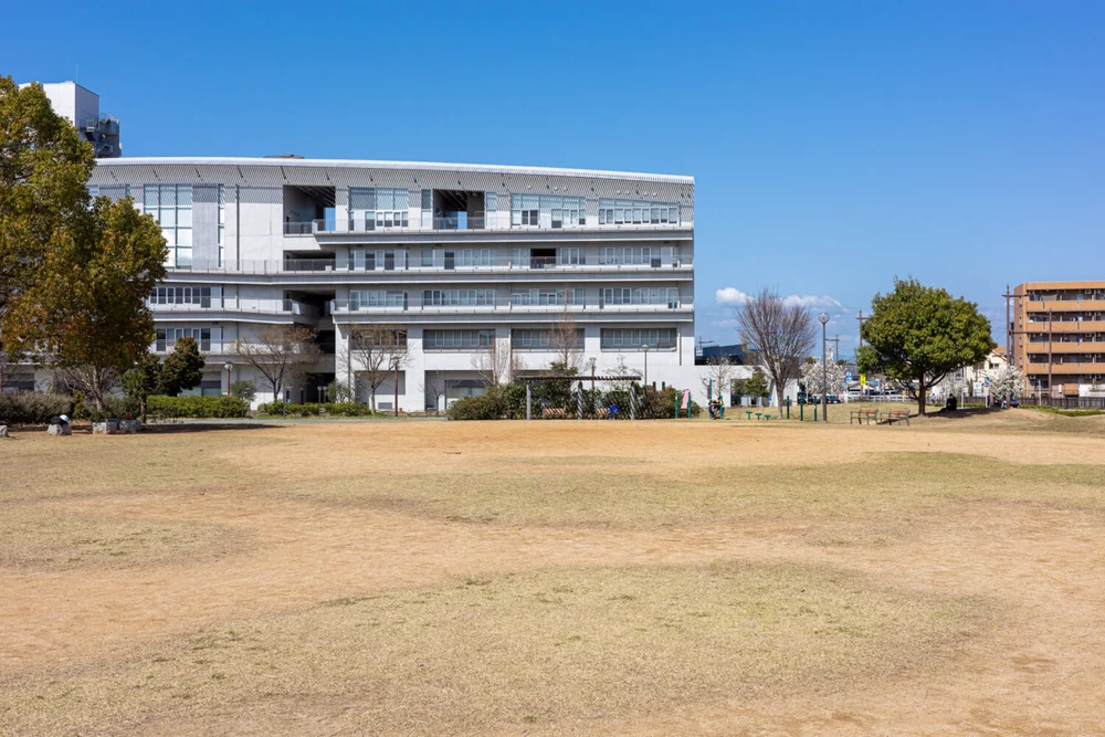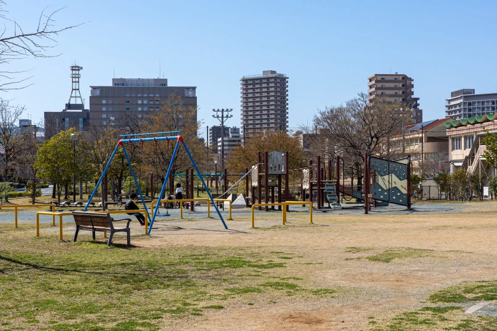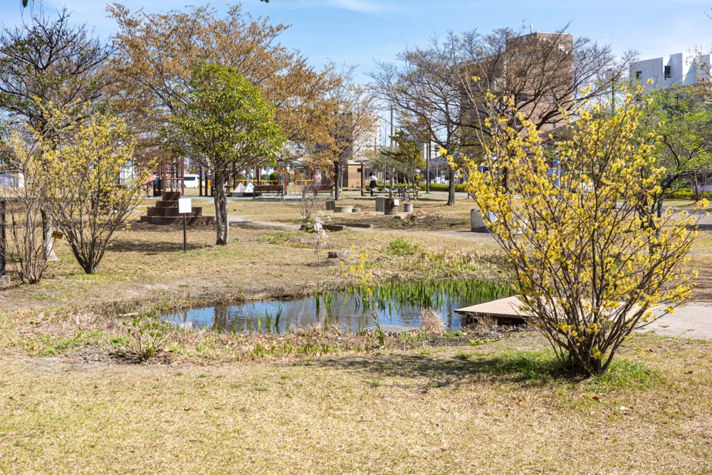 JR浜松駅から北へ約1kmの位置にある静岡文化芸術大学の南隣にある「野口公園」。園内には広々とした芝生広場や遊具、バスケットゴールのあるスポーツ広場、また小さな小川と池があるビオトープエリアなどがあり、子供はもちろん運動目的の大人まで幅広く利用できる公園です。