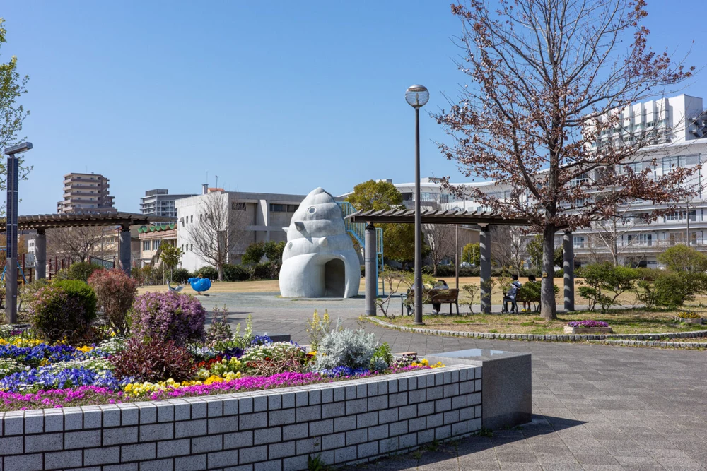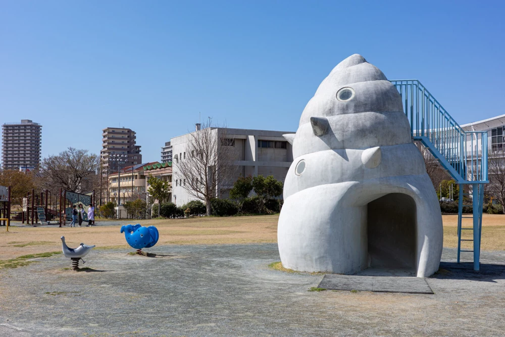 野口公園のシンボル?貝殻型のすべり台。公園を象徴するような遊具やオブジェがあると愛称や仲間内だけの呼び名が生まれ、何だか特別な場所に感じるから不思議です。(野口公園が貝殻公園と呼ばれているかは未確認…)