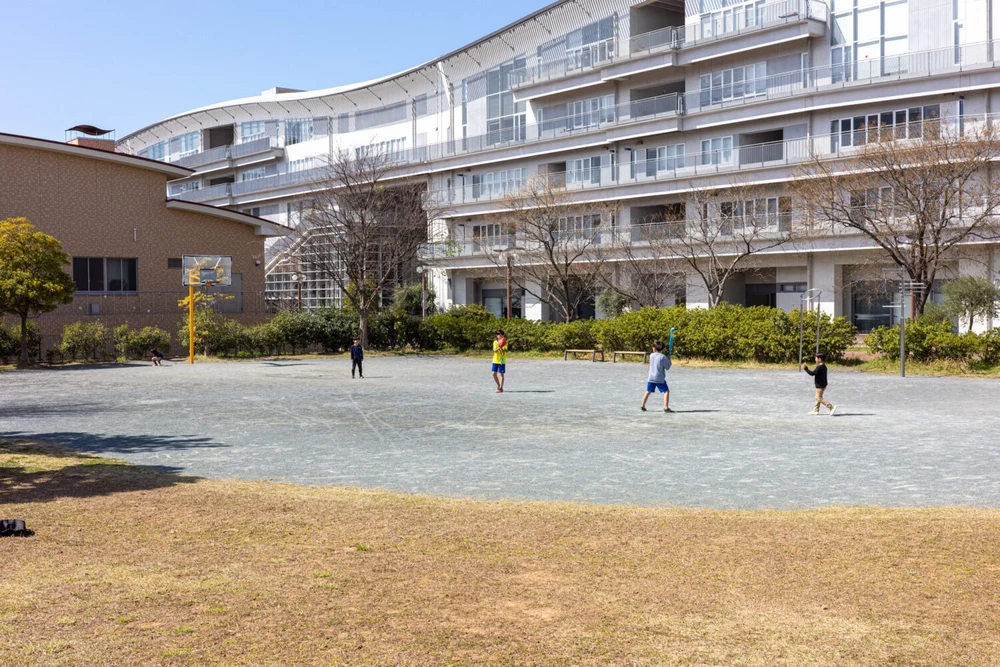 取材時はちょうどWBC開催真っ只中!有名選手の名前が飛び交い盛り上がっている様子はなんとも微笑ましいバスケットゴールがある地面が砂利の広場。東側大通りから奥まった場所なので、子供のゴムボール野球であれば問題なさそう。