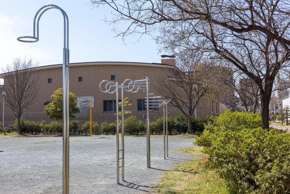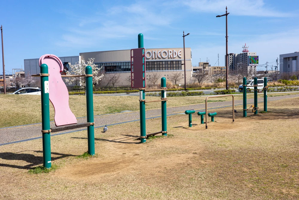こちらは子供用の遊具というよりは、健康増進用の器具のようです。街中ウォーキングの途中に立ち寄ってみてはいかがでしょうか。もっとハードにトレーニングしたい方は隣のスポーツ広場の懸垂バーがおすすめ。