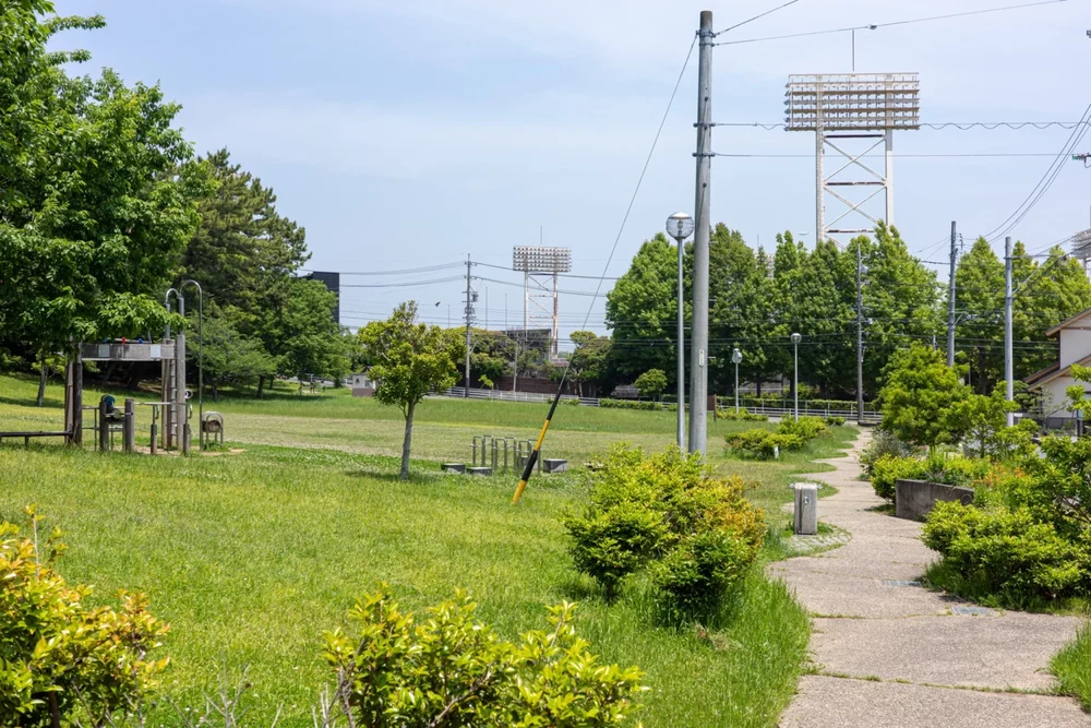 奥には野球場のナイター設備が見えます。四ツ池の遊歩道から別れた細い坂道をのぼると鬱蒼と繁った木々から一変した開けた芝生広場があらわれます。遊具は1台だけあるな、と近づいてみると・・・