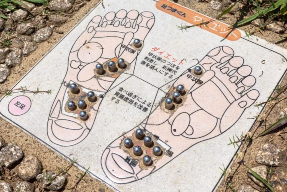 健康遊具の隣には激痛必至!?の足つぼコーナー。もちろん靴を脱いでチャレンジしてみてください。