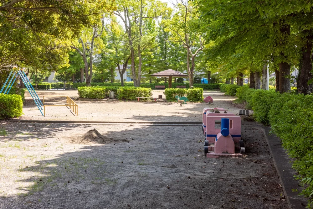 芝生広場から道路を隔てた向かいにある、砂場と少しだけ遊具がある広場。隔てた道路に横断歩道はなく、交通量も多いので横断には十分注意しましょう。
