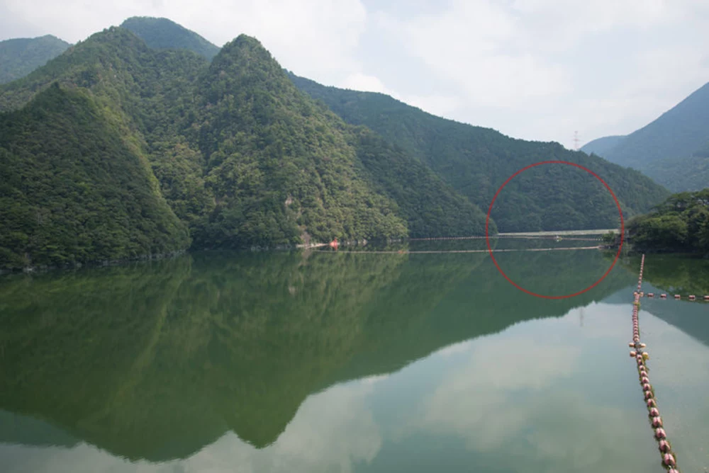 佐久間湖。水面奥の白い岸のように見えるものは、主に流木が集まったものです。これらの流木はダムの出水時に障害になるため、流下しないように網でせき止められており、定期的に引き上げ、処分されているそうです。