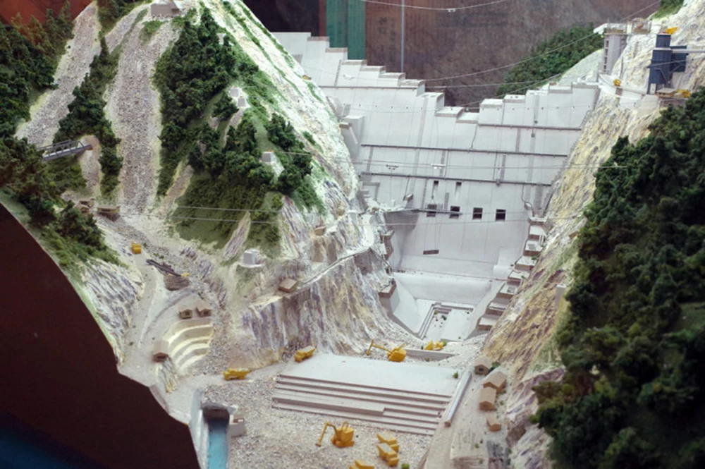 佐久間ダム建設風景のミニチュア模型(縮尺1:400)戦後の急増する電力需要に応えるため、短期間での建設を目指して工事は始まりました。1日のコンクリート打ち込み量は、当時、世界でも最高の記録であったそうです。しかし、作業員の転落や落石などの事故があとをたたず、ダム完成までに96名もの殉職者がでています。