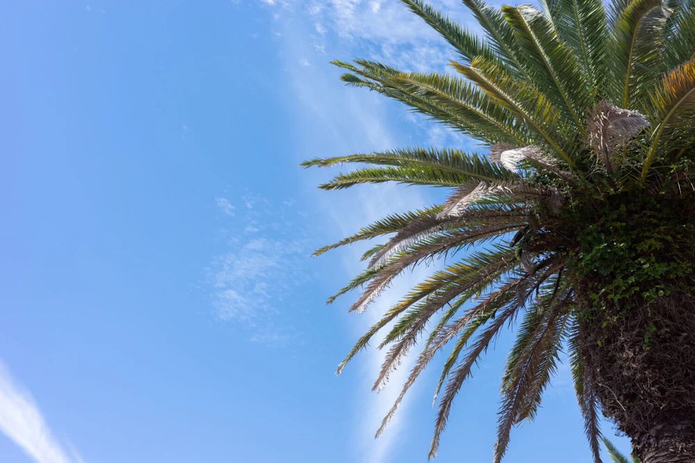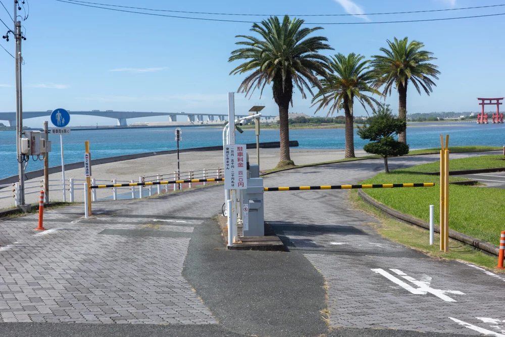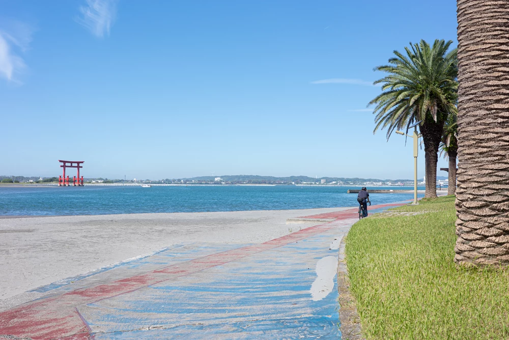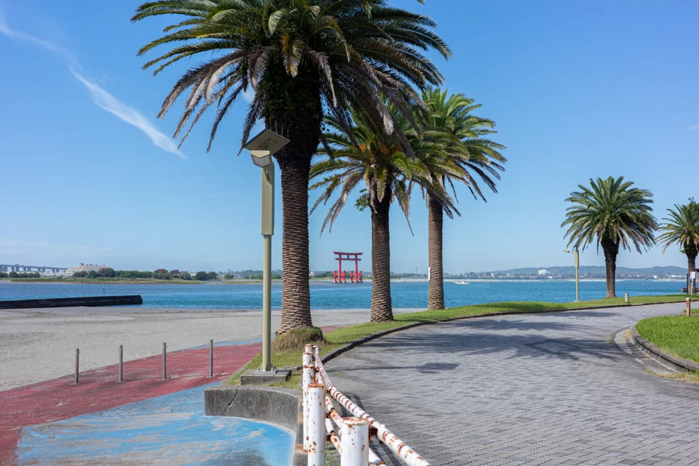 浜名湖の穏やかな波が打ち寄せる弁天島海浜公園。浜名湖に沿った東西500メートルの遊歩道。広がる青い空にそびえ立つ椰子の木が、まるで南国リゾートのような非日常的な空間を作り出しています。