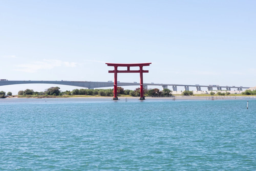 浜名湖の中洲干潟(いかり瀬)に建っている赤鳥居は弁天島観光のシンボルタワー。