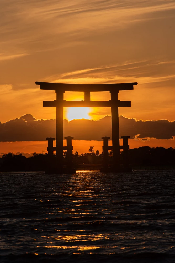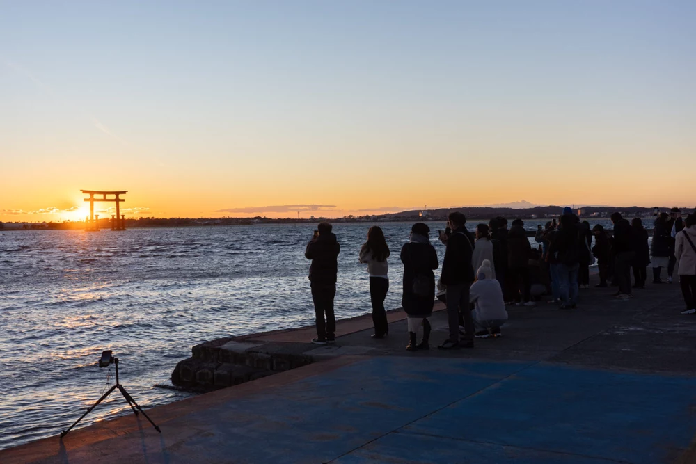 一年を通して楽しめる弁天島海浜公園ですが、11月中旬から1月中旬頃は鳥居の中を沈む夕日が見られるため、特別な瞬間を収めようと多くのカメラマンが訪れます。