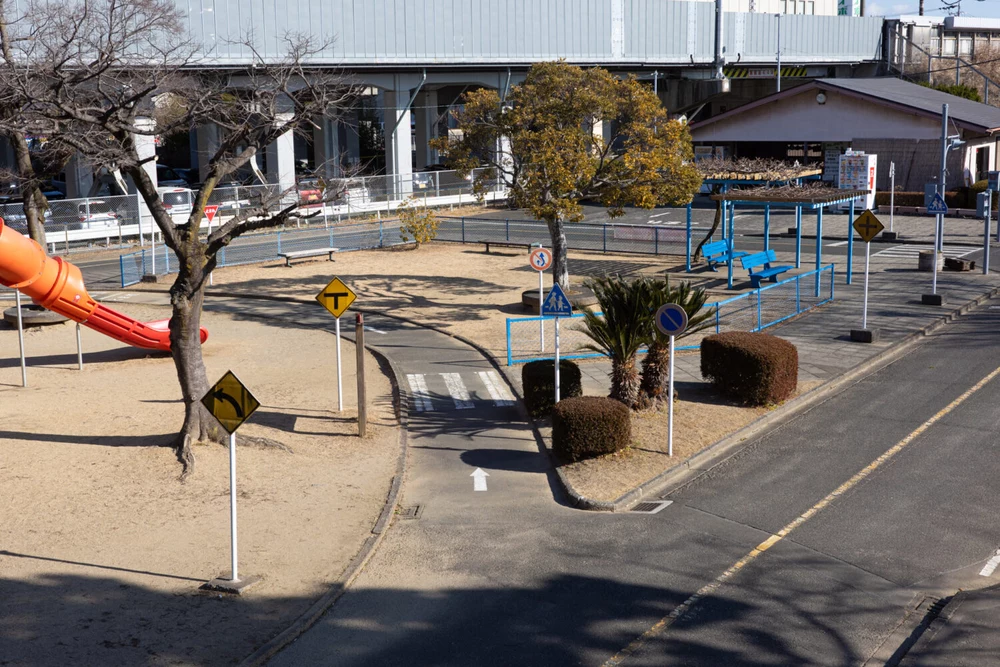 相生公園は、公園内に本物の道路と同じように信号機や横断歩道、踏切、標識などが設置されており、子どもが実際に自転車に乗りながら交通ルール体験学習ができるユニークな公園です。小学生以下の自転車の無料貸出や夏季限定のプール、遊具、フェンスのある自由広場もあり、遊びどころ満載!(自転車の持ち込みはできません。園内で乗れるのは無料で貸し出されている自転車のみとなります)