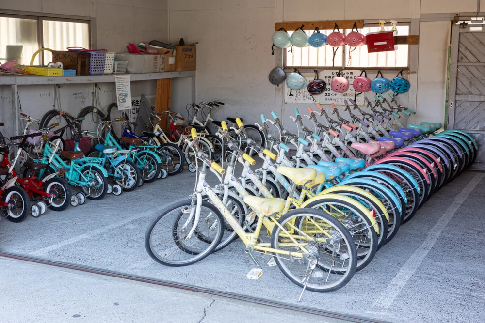 補助輪付きの自転車やヘルメットも貸し出されています自転車の持ち込みはできません。園内で乗れる自転車は管理棟で無料貸し出しされています。