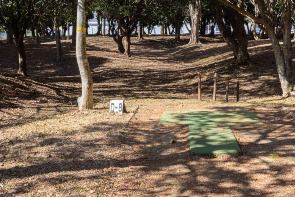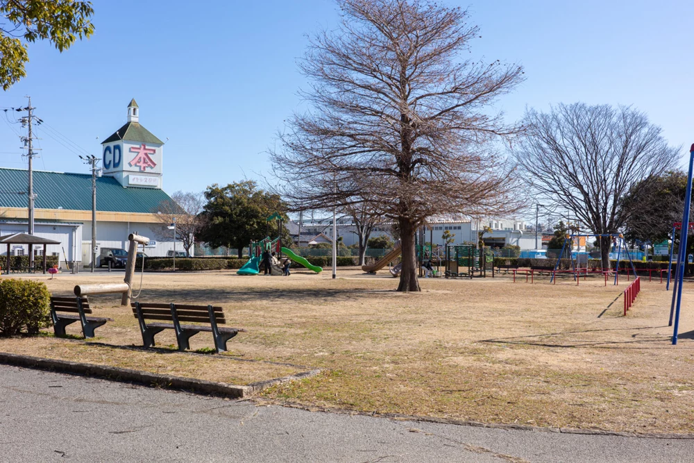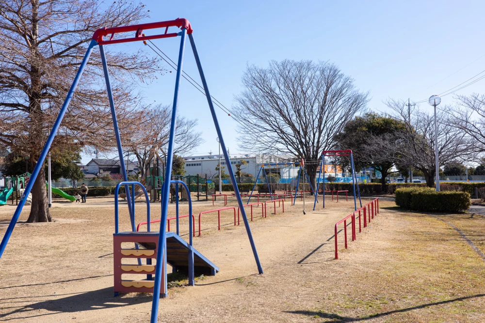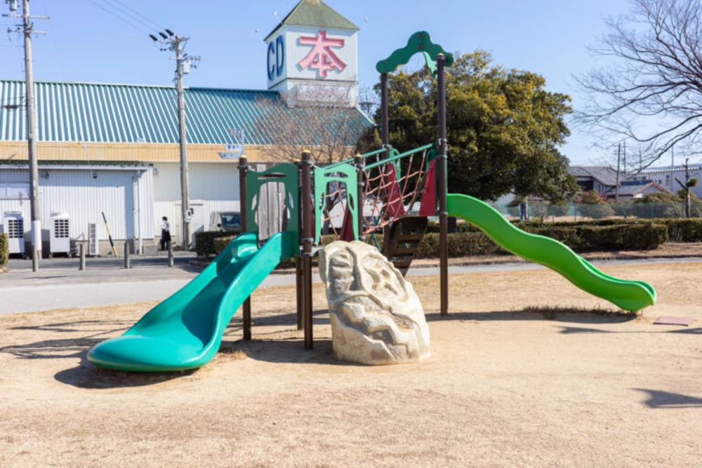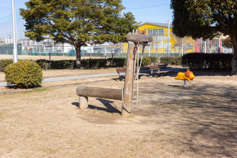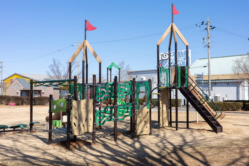 駐車場から東側に3分程歩いたところにある遊具広場。大小2つのの複合遊具やターザンロープ、ブランコなどが揃っています。