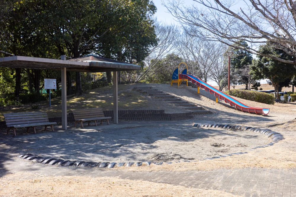 暑い季節に嬉しい屋根付きのベンチの前には広々とした砂場があり、その周囲には埋め込みタイヤがアクセントとして施されています。