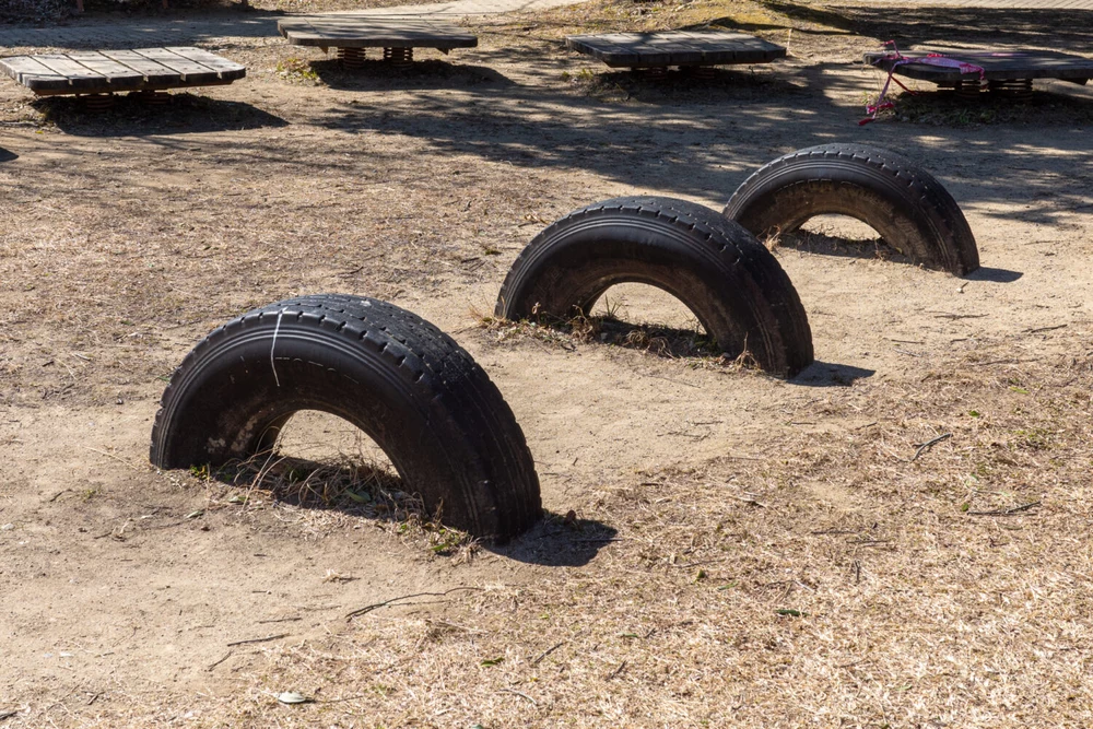 昔はどこの公園にもあった(埋め込み)タイヤ遊具。タイヤの上を飛んだり、リズムよく馬跳びをしたりして楽しんでいました。
