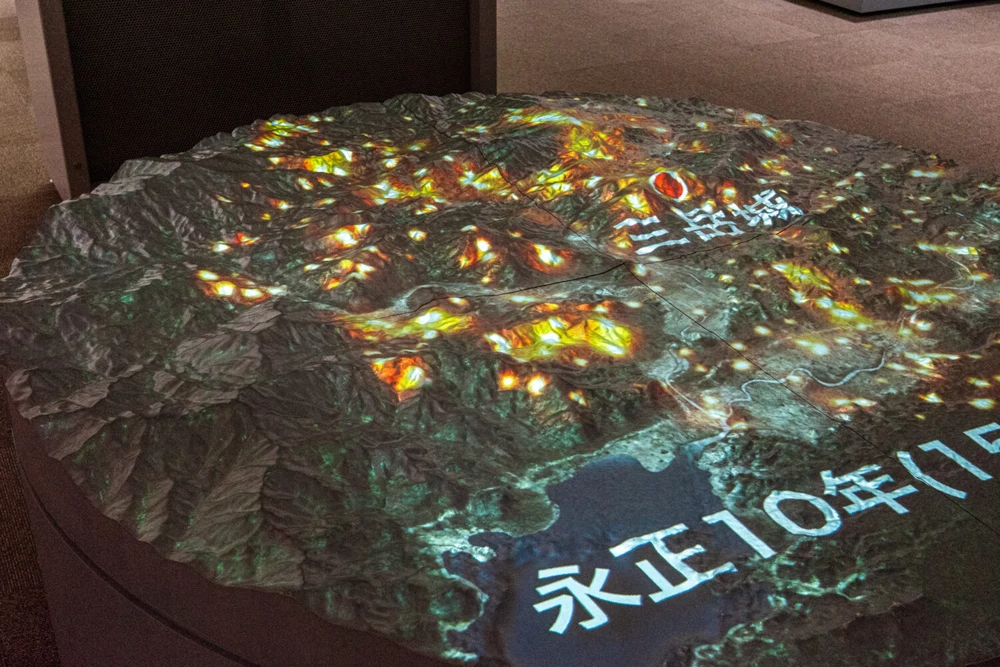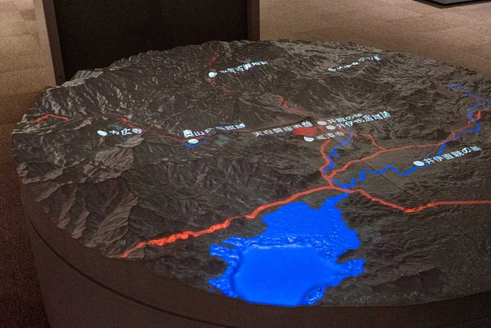 井伊直虎の生涯や井伊谷周辺の歴史をジオラマ(立体模型)に映像を重ねた技術、プロジェクションマッピングと音声解説により、地域の地理や歴史を迫力たっぷりに、わかりやすく学ぶことができます。