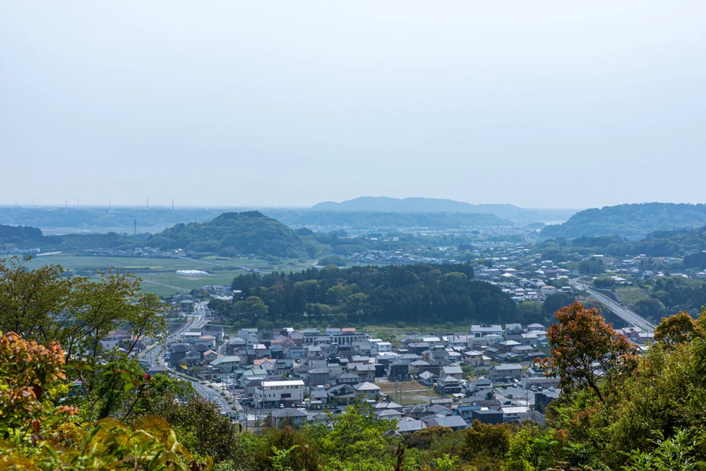山頂は小さな広場になっています。テーブル付きのベンチもあり、ピクニックにもおすすめです。注目は、眼下に広がる井伊谷の景色。歴史ある街並みを一望できる、絶好のビューポイントです。